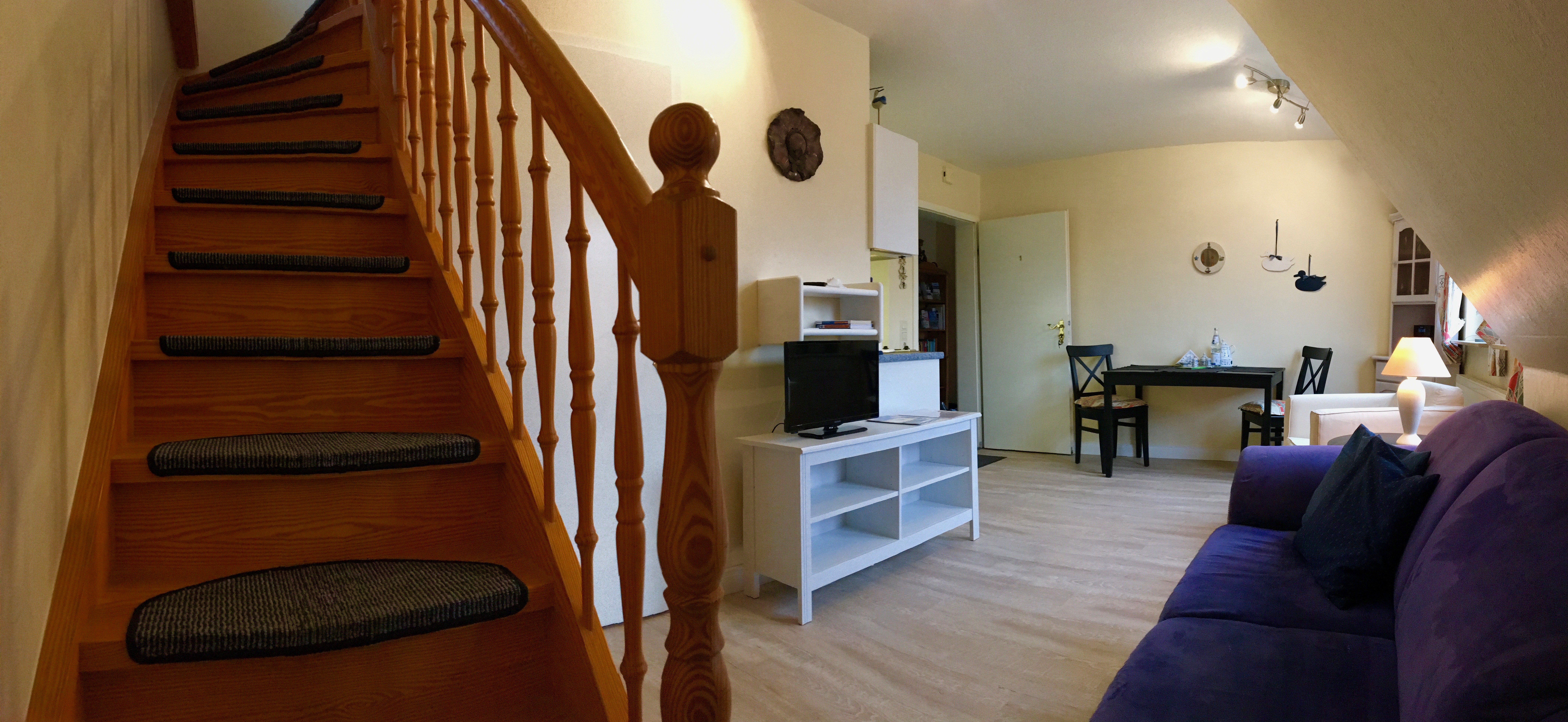 Wohnraum im Obergeschoss · Schlafzimmer im Dachgeschoss (Doppelbett 180 x 200 cm)