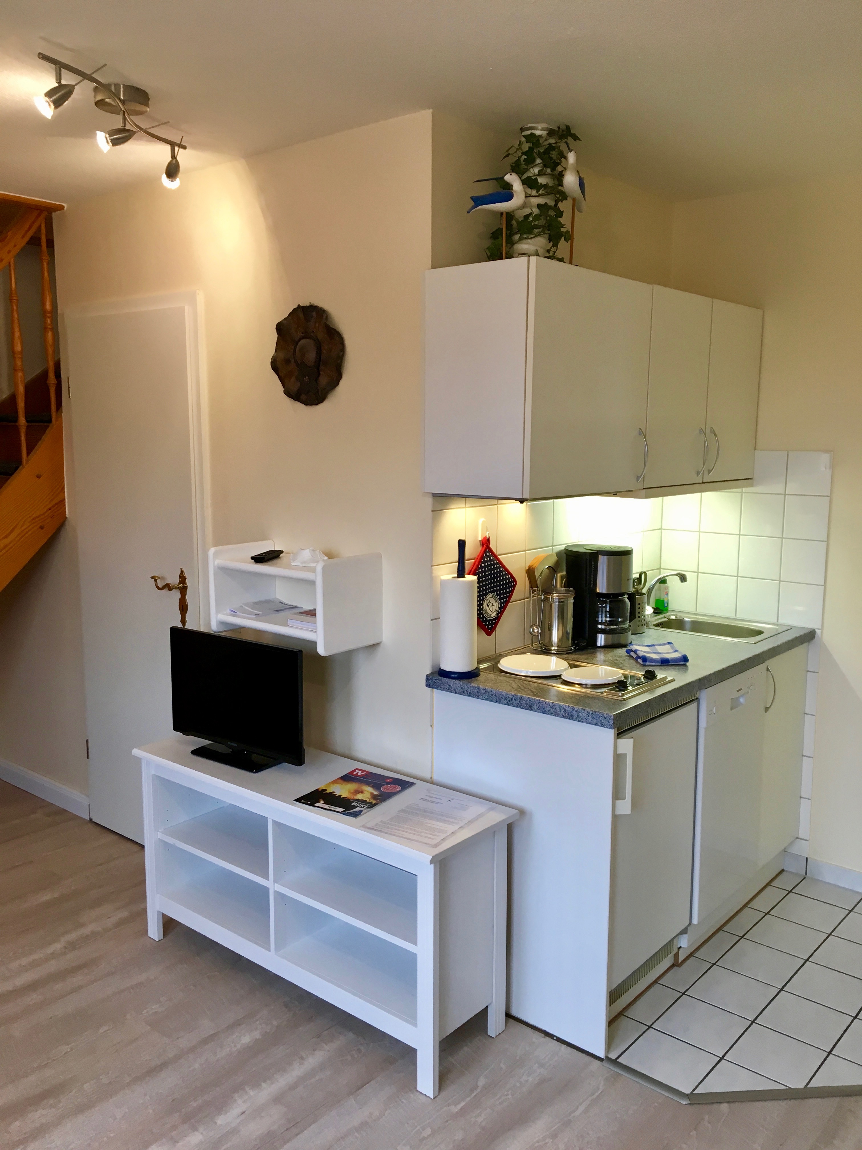 Küchenzeile mit Spülmaschine, Kühlschrank und Kochgelegenheit · Kaffeemaschine ·Wasserkocher · Toaster