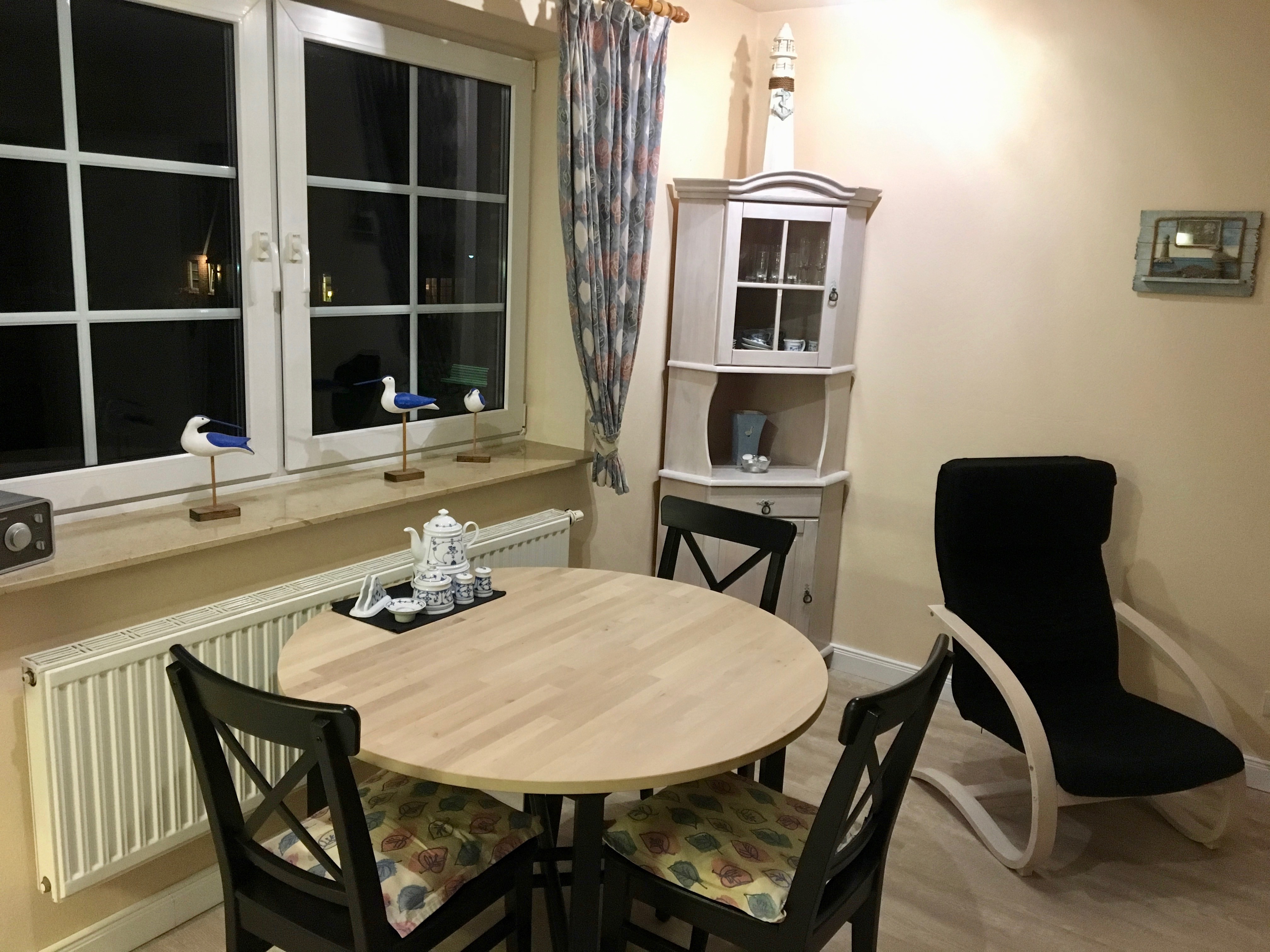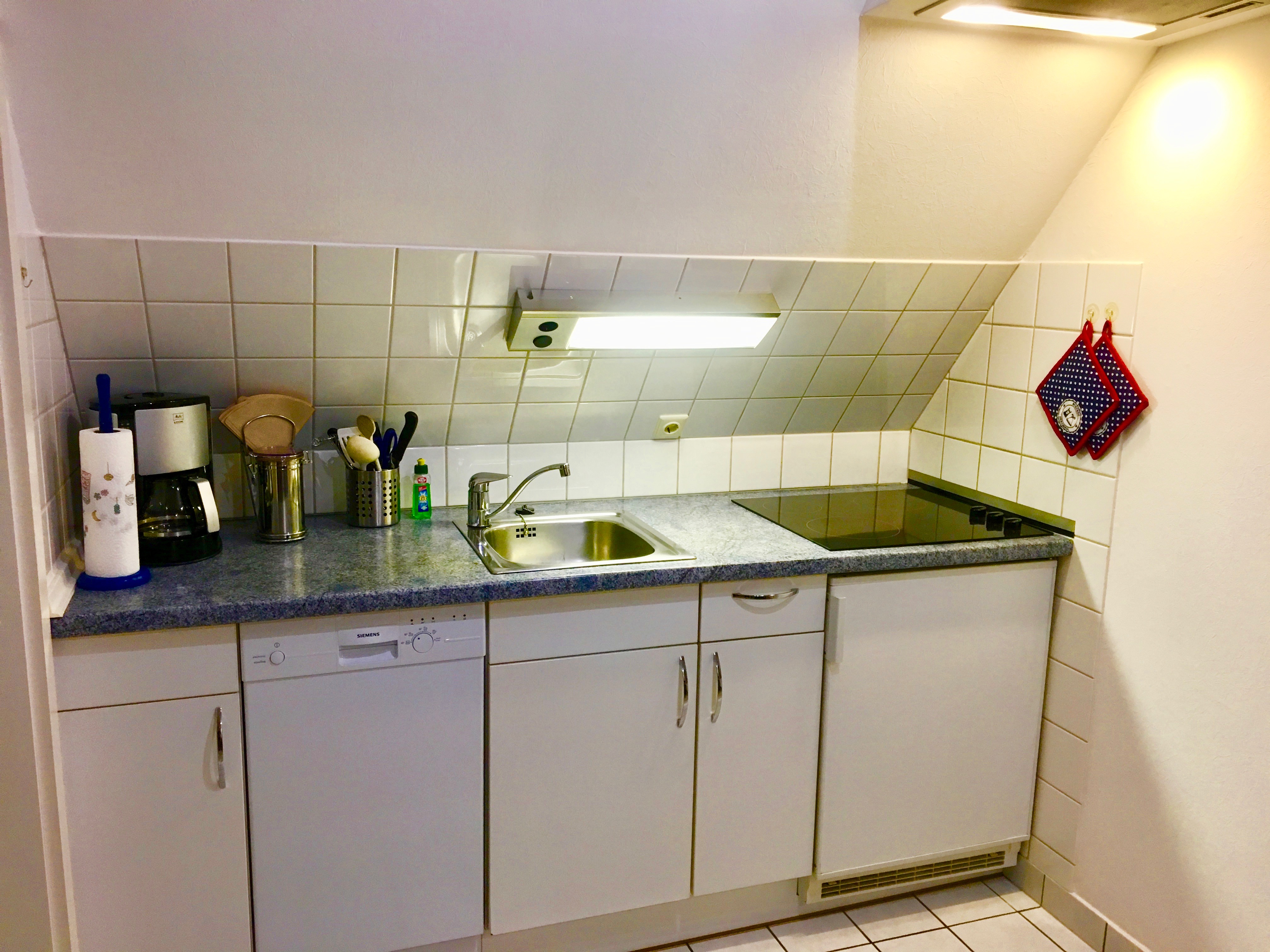 Essplatz mit schönem Meerblick · Küchenzeile ausgestattet mit Spülmaschine, Kühlschrank und Kochfeld sowie Kaffeemaschine, Wasserkocher und Toaster