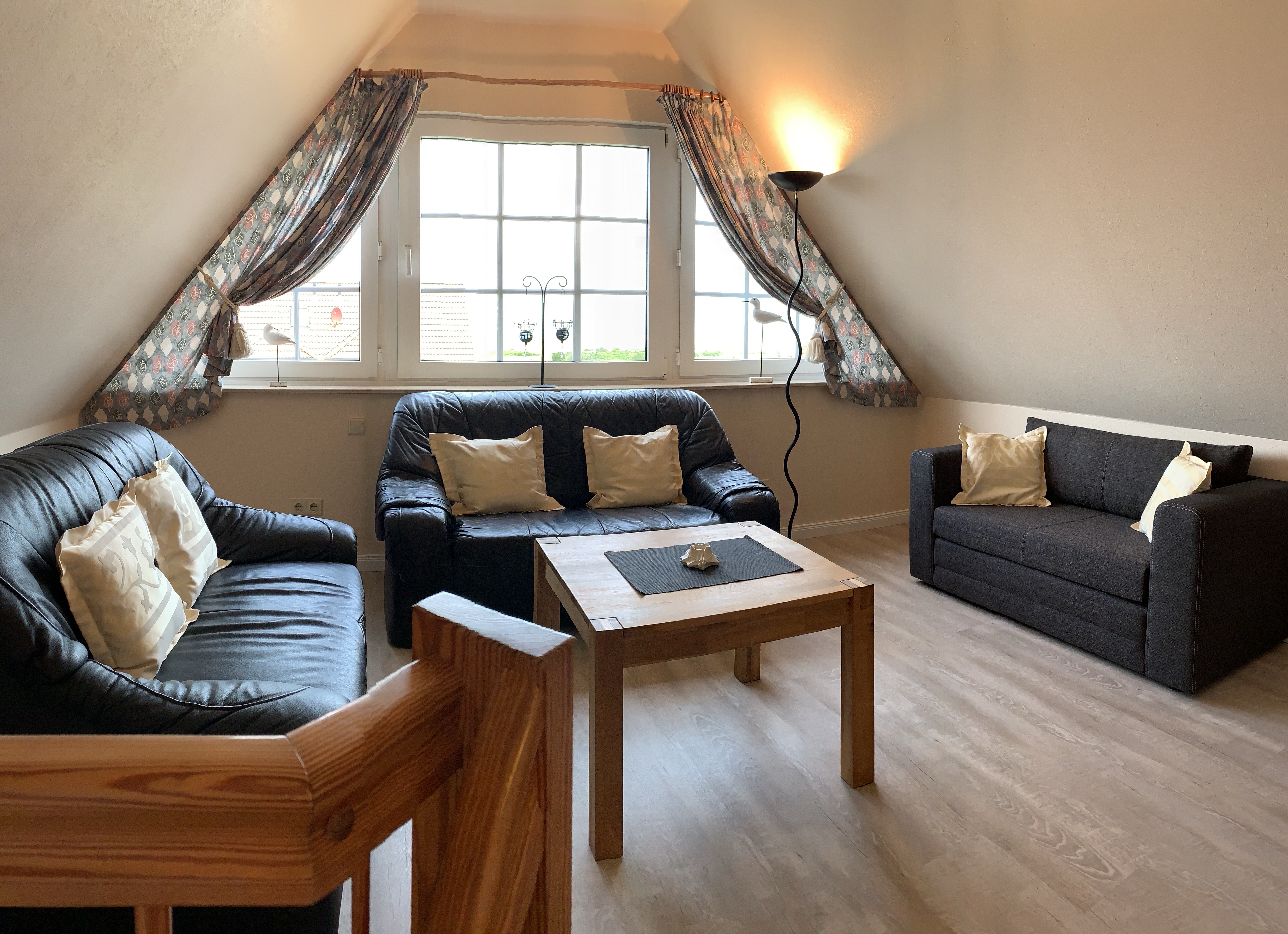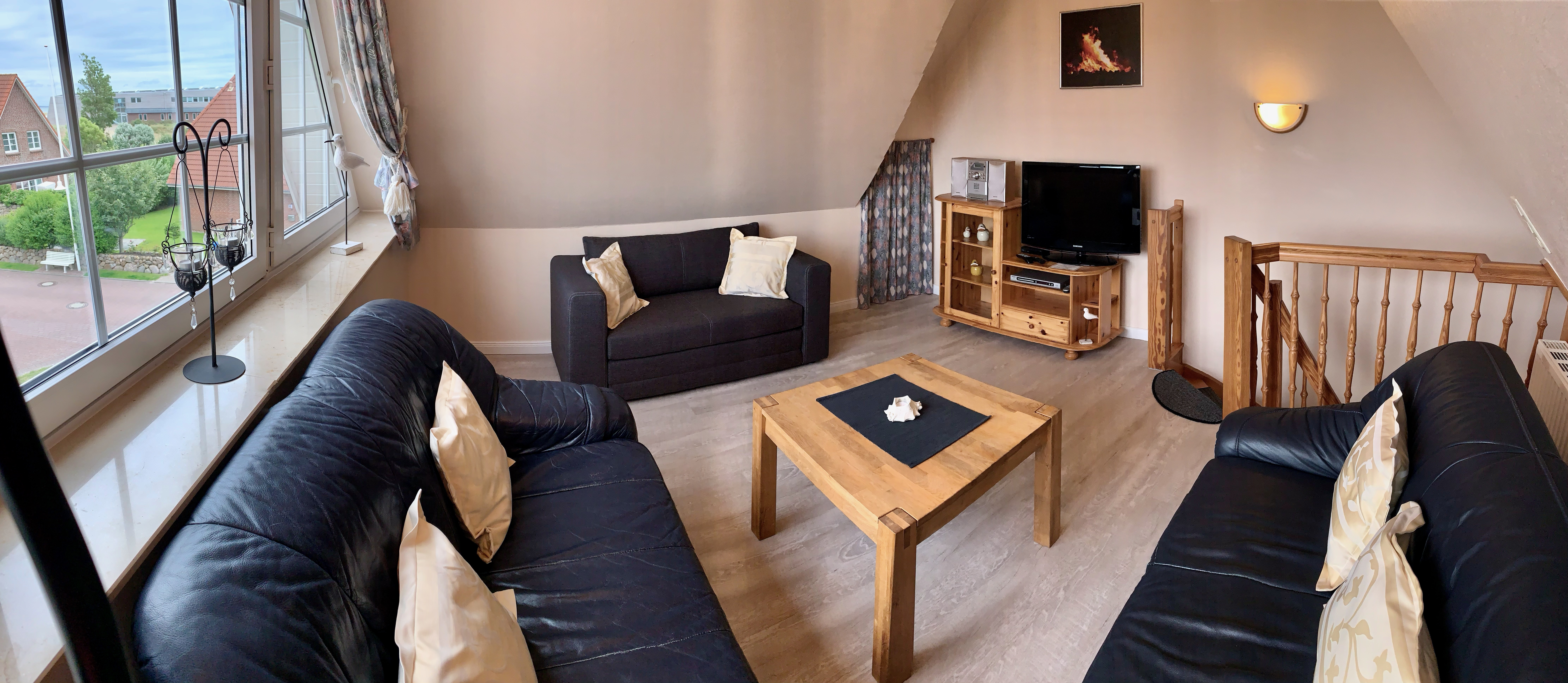 Wohnraum im Dachgeschoss mit Fernseher, Musikanlage und tollem Meerblick · Schlafcouch